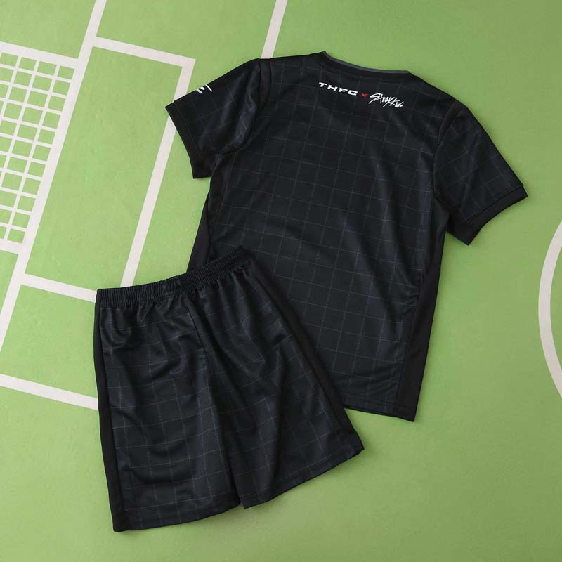 The Tottenham 25-26 away kit is predominantly black with grey accents and white logos, marking the first black away shirt in over 10 years and featuring a subtle “SPURS” pattern.